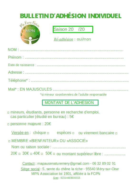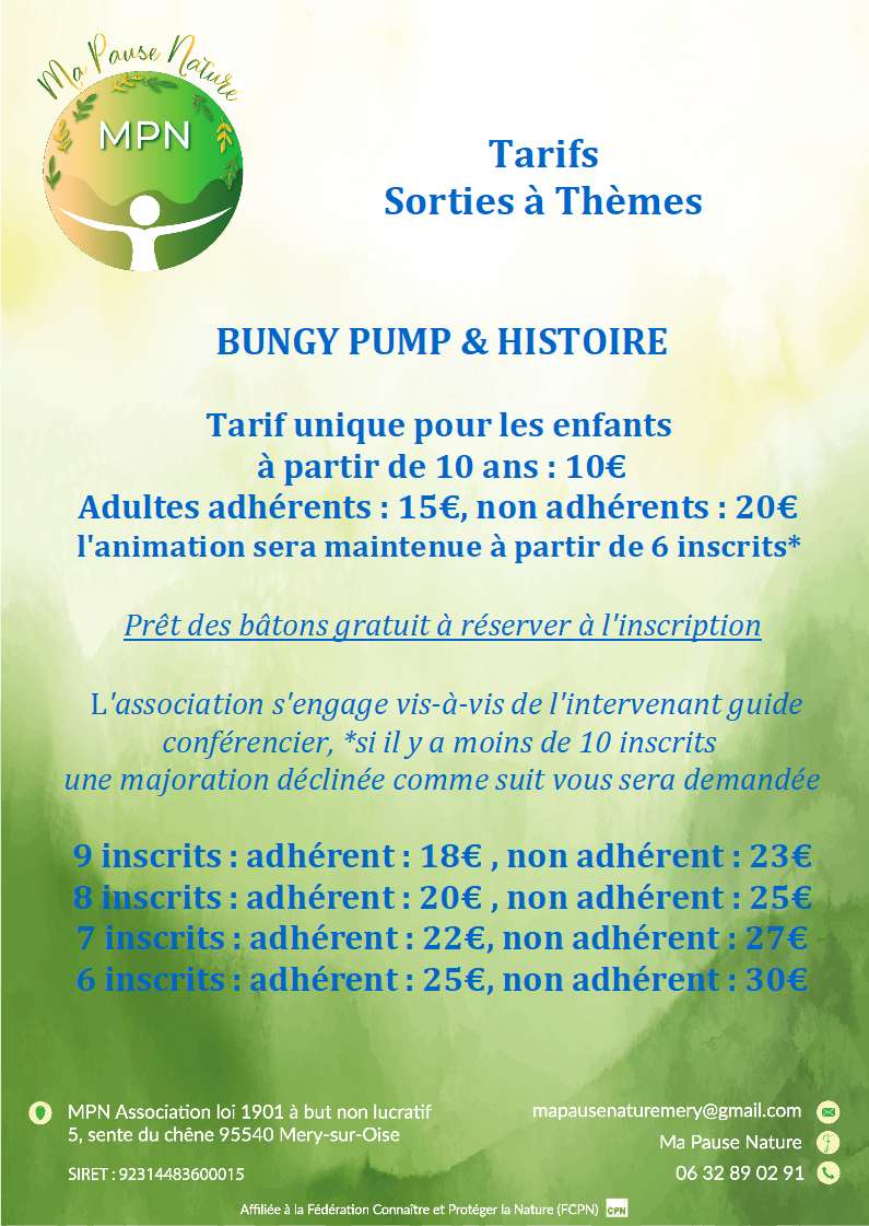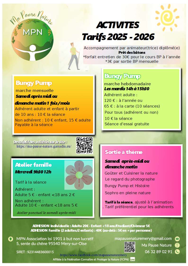 TARIFS 2025-2026Tarif Sophrologie en pleine natureTarif Bungy Pump & HistoireBulletin d'adhésion individuel à MPNBulletin adhésion Famille à MPN Tarif sortie à thème BP & Histoire Document PDF — 3 Mo Tarif Sortie à Thème SOPHROLOGIE Document PDF — 3 Mo Tarifs version hyperliens FB et Garradin sept 2025 Document PDF — 6 Mo